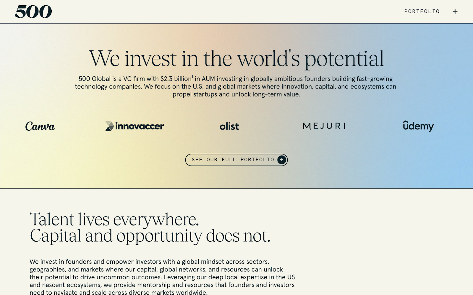 500 Global launched in 2010 and has grown into an active early-stage investment platform, with more than $2.4B in assets under management. The firm typically writes pre-seed and seed checks in the $100K-$500K range and invests across more than 80 countries. 500 Global runs an accelerator program that gives founders structured support in customer development, fundraising, and early go-to-market strategy.